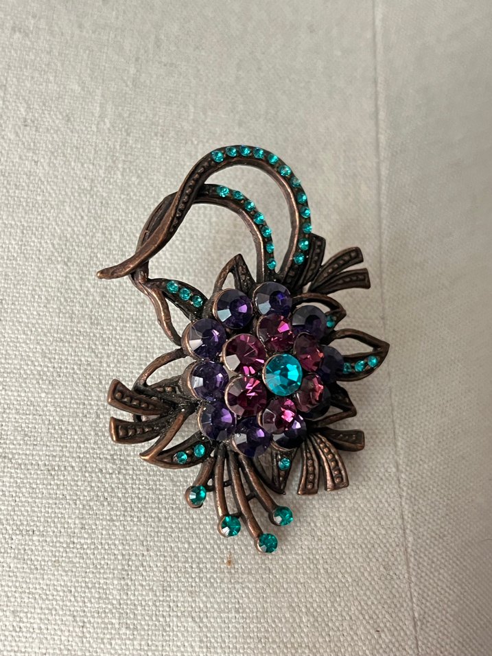 Mor taşlı, turkuaz detaylı koyu renk çiçek broş. Vintage bohem tarzda.