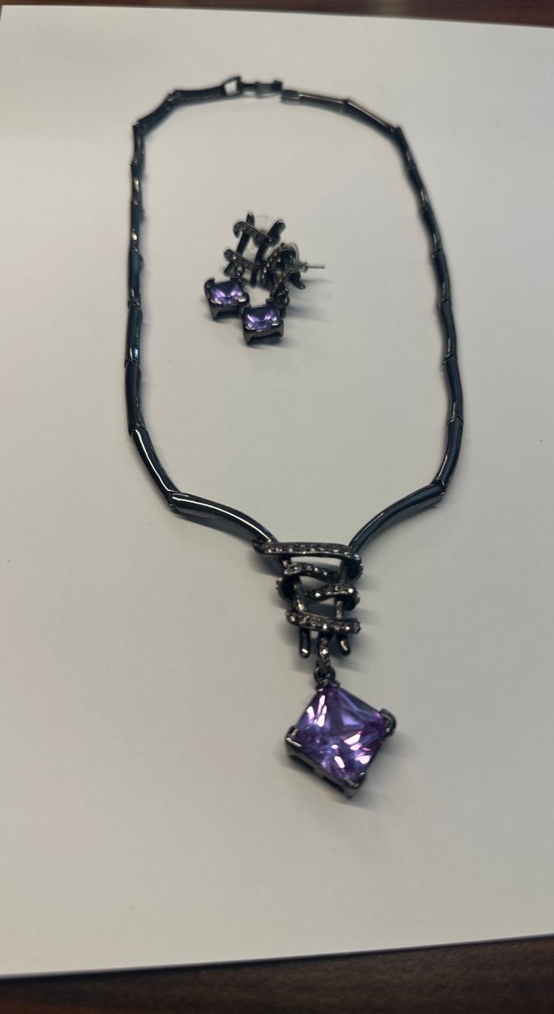 Zincir detaylı gotik kolye ve küpelerden oluşan mor taşlı takı seti, şık ve avangart bir tarz sunar.