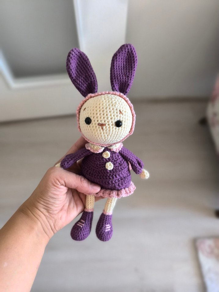 Pastel mor renkli, uzun kulaklı tavşan figürlü el yapımı örgü bebek. Yumuşak iplikten örülmüştür, sergilemek veya hafif oyun için uygundur.