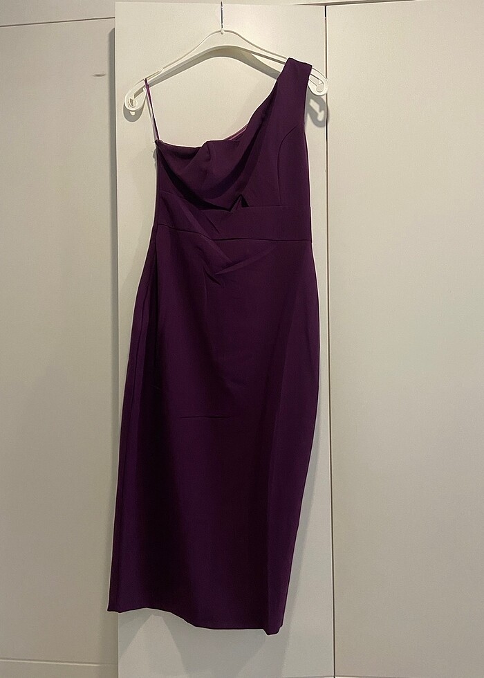Ürünün tek omuz patlıcan moru rengnde bir elbisedir göğüs altı pencere dekoltesi vardır arkada ufak bir yırtmacı mevcut