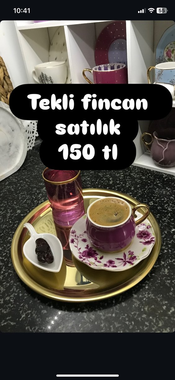 Altın saplı koyu mor kahve fincanı, çiçek desenli tabağı ile altın tepside sunulmuştur. Tekli fincan satılıktır. ☕