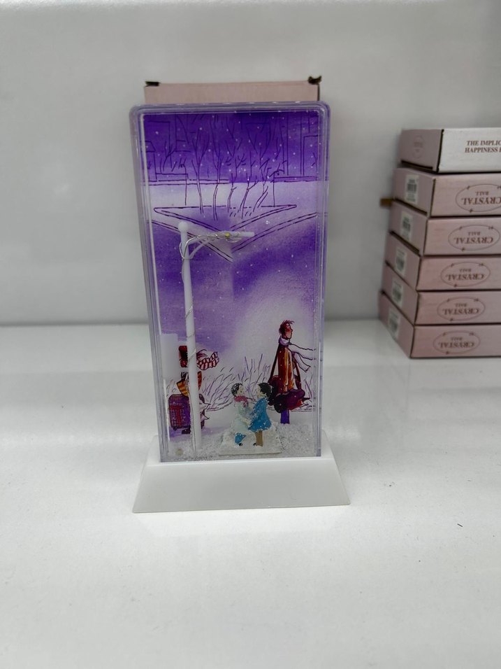 Mor temalı arka plan ve sokak lambası ile küçük figürlerin yer aldığı dekoratif obje. Hafif mor renkli kutuda detaylı bir sahne sunar. ️