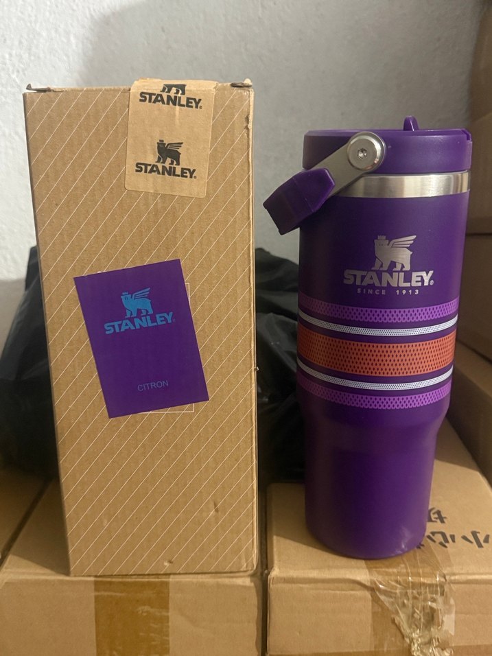 mor termos matara, sağlam sap ve güvenli kapak içerir. İçecekleri sıcak veya soğuk tutar, çocuklar için uygundur. Renkli yatay çizgiler ve Stanley logosu bulunur.