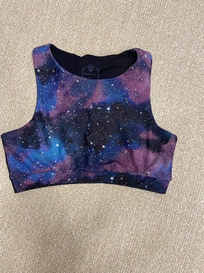 Mor renkli, tie-dye desenli bu atlet sütyen, koyu tonlarda ve normal boyda, athleisure sokak giyimi tarzına uygundur.