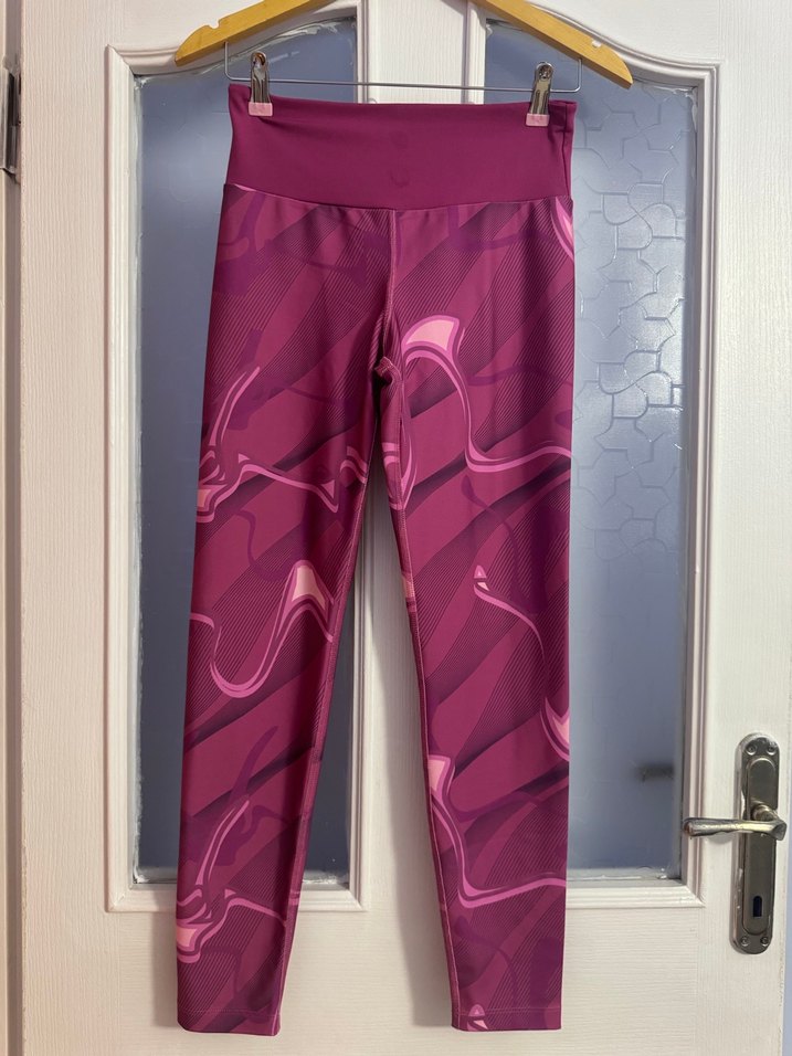 Mor renkli, bağlama desenli, esnek sentetik kumaştan yapılmış, spor için uygun, normal boyda ve vücuda oturan kadın taytı.