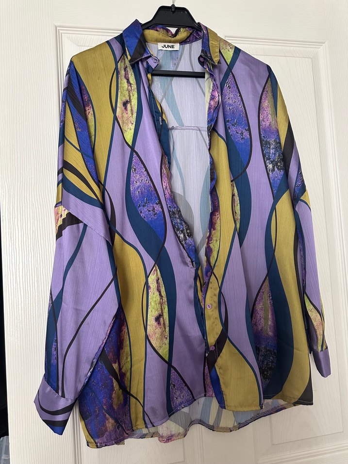 Mor pastel tie-dye desenli, bol kesim, ipeksi dokulu uzun kollu ve V yakalı bohem kadın gömleği. Rahat ve şık bir görünüm sunar.