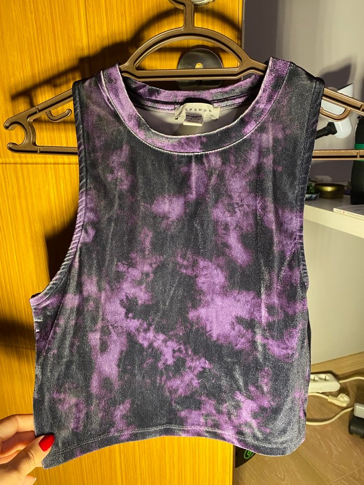 Yüksek yakalı, kolsuz ve vücuda oturan kesimde, koyu mor tie-dye desenli crop top. Pürüzsüz sentetik kumaştan, trend sokak stili için uygun.