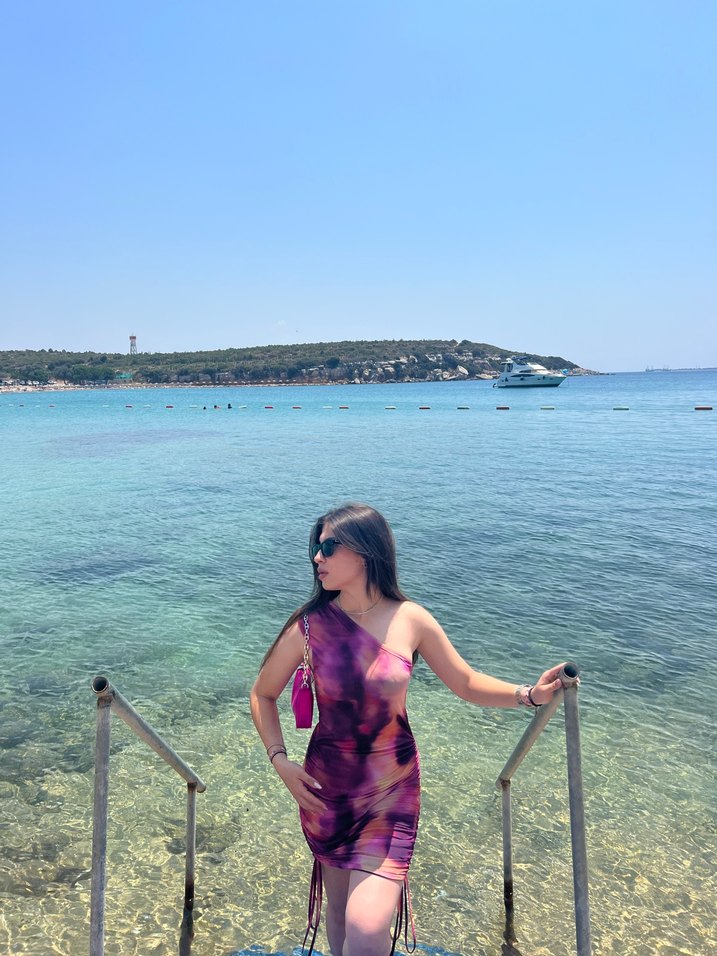 Koyu mor tie-dye desenli, transparan kumaştan, kolsuz ve vücuda oturan midi pareo. Açık hava bohem tarzı için ideal.
