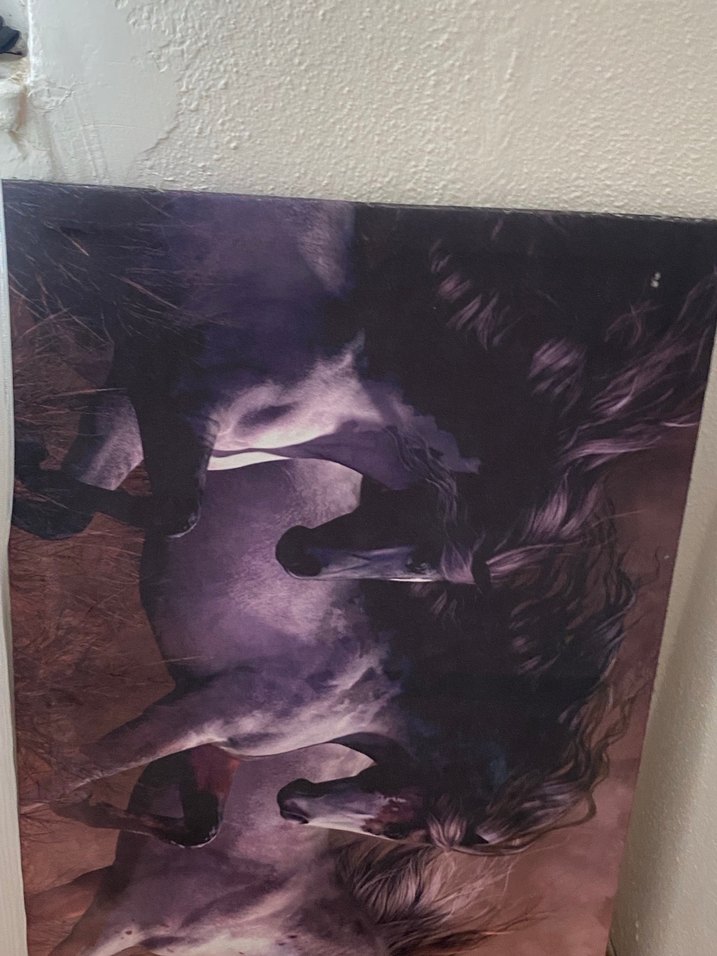 Mor tonlarda, atların hareketini ve akan yelelerini gösteren koyu renkli bir tablo.