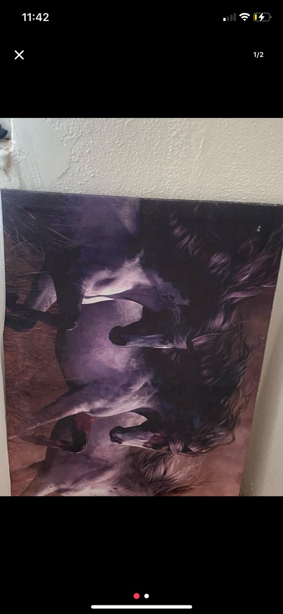Mor tonlarda, karanlık bir atmosfer yaratan atların bulunduğu tablo. Atların akan yeleleri ve hareketli duruşları dikkat çekiyor.