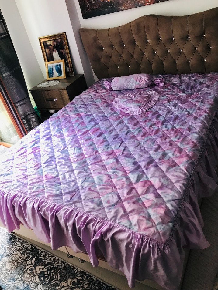 Mor tonlarda pastel batik desenli, kapitone dokulu ve fırfırlı kenarlara sahip yatak örtüsü, yatak odanıza yumuşak bir dekoratif hava katar. ️3 parça