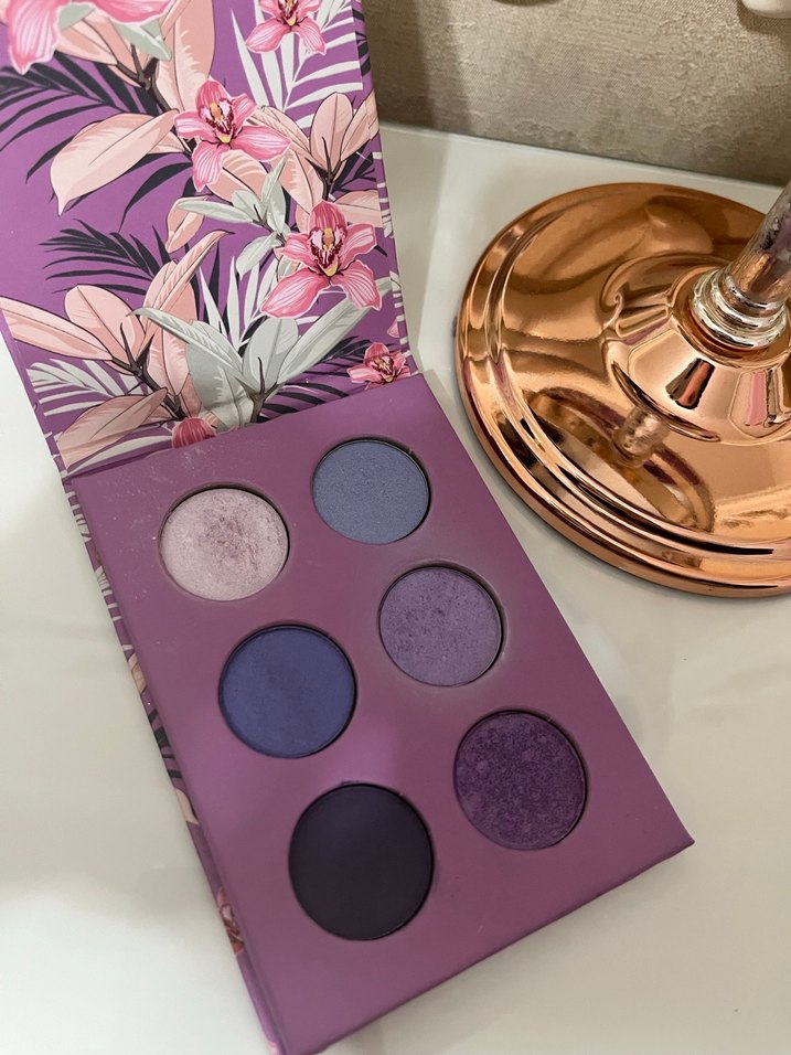 Altı koyu mor ton içeren, çiçek desenli ambalajda göz farı paleti.