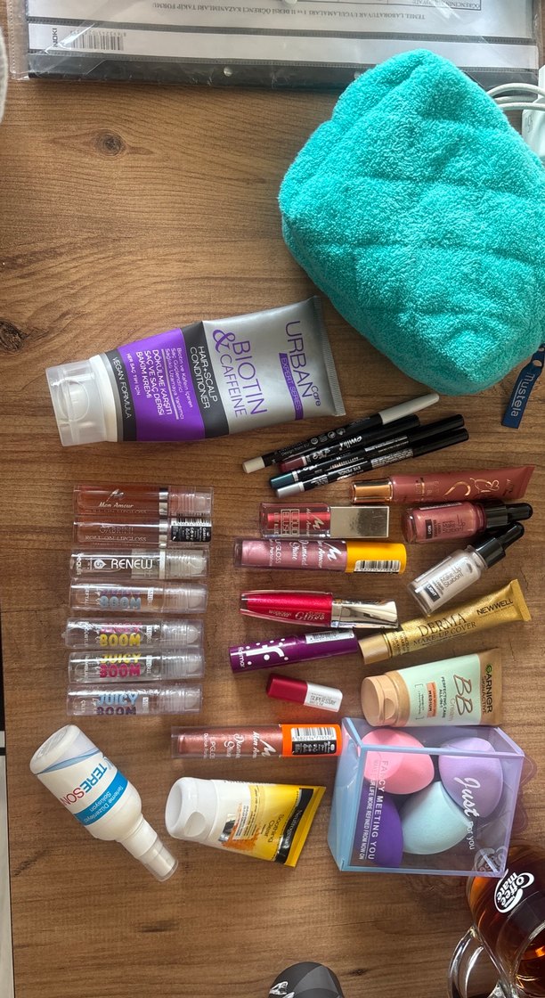 Bu makyaj seti, açık mor tonlarında ürünler, makyaj süngerleri ve cilt bakım ürünleri içerir. Biotin ve kafein kremi, rujlar, göz kalemleri ve BB krem bulunur.