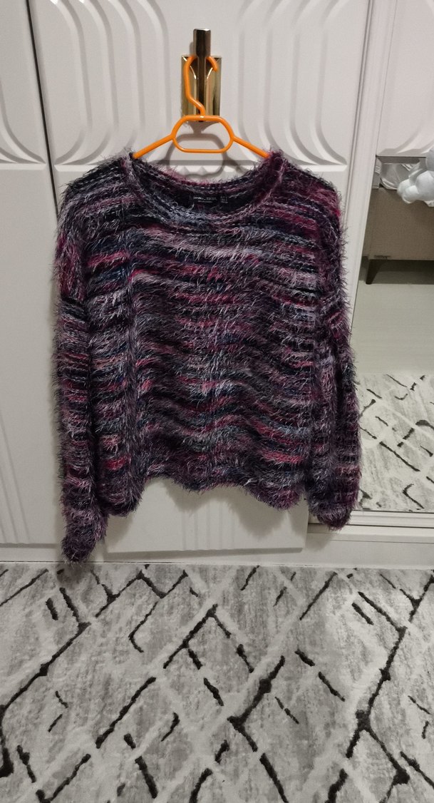 Mor tonlarda, uzun kollu ve yuvarlak yakalı örgü kazak. Rahat kesimi ve bağlama desenleriyle bohem ve rahat bir tarz sunar.