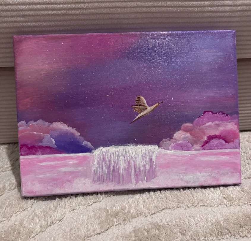 Bulutlar, şelale ve uçan bir kuşun yer aldığı mor tonlarda pastel manzara tablosu. Yumuşak renkler huzurlu bir atmosfer yaratır. Tablo ölçüsü : 25x35