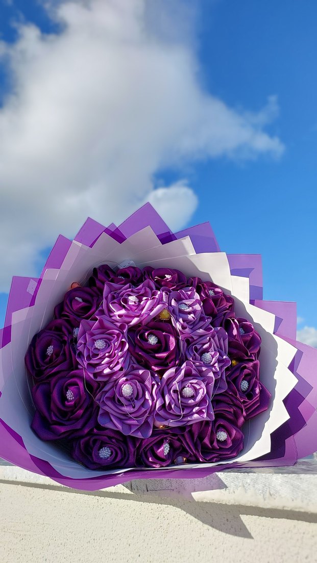 Mor tonlarında detaylı yapraklara sahip el yapımı çiçek buketi, katmanlı mor ve beyaz kağıtla sarılmış.