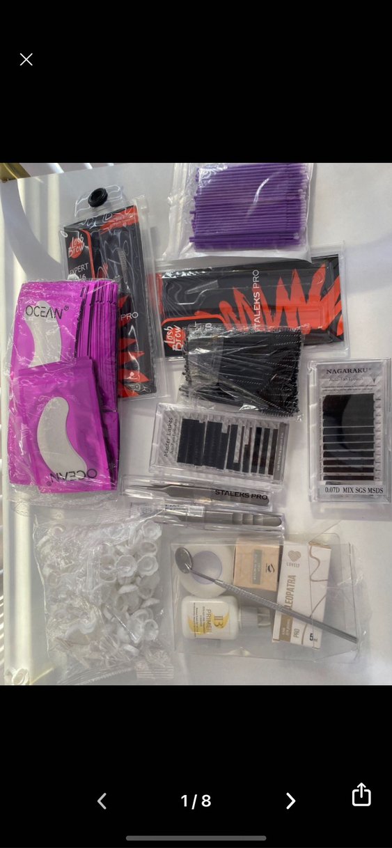 Mor tonlarında sahte kirpikler ve kirpik uygulama için aplikatör, fırça ve yapışkan pedler içeren aksesuar seti.