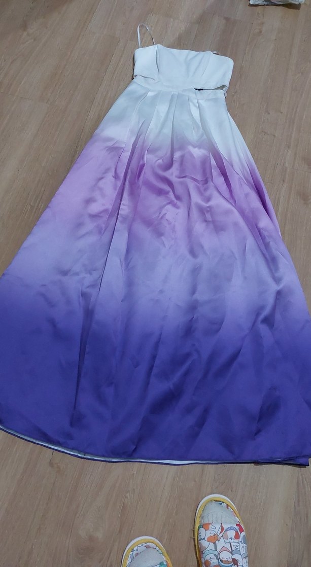 Pastel mor tonlarında, ipek dokulu, salaş kesim, drapeli ve batik desenli uzun cepli elbise. Bohem tarzda, düğünler için uygundur. Üst kısım biraz sararmış askıda durmaktan yıkayınca çıkar kirlenmiş sadece.