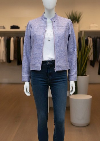 Bu eşsiz ceket, dolabınıza farklı bir hava katacak. Lila ve bej tonlarının zarif birleşimiyle oluşturulmuş yılan (snake) desenli deri görünümlü kumaşa sahiptir. Tasarım Detayları: Biker/Motorcu ceket tarzında, dik yakalı ve tam boy lila fermuarlıdır. Kullanım Alanı: Hem günlük jean pantolon kombinlerinizle hem de siyah bir elbise üzerinde akşam dışarı çıkarken rahatlıkla kullanabilirsiniz. Bahar ve serin yaz akşamları için idealdir. Kumaş Hissi: Yumuşak dokusu sayesinde oldukça rahat bir giyim sunar. Kusurlar: Hiçbir yırtık, sökük veya leke bulunmamaktadır. Sıfırdan farksız durumdadır.