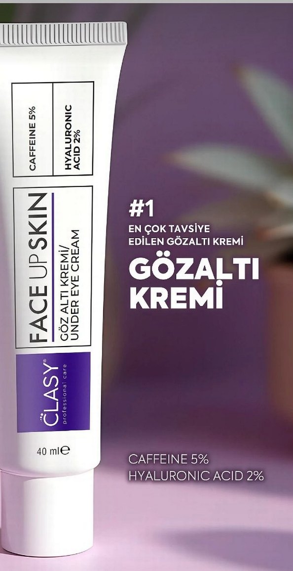 %5 kafein ve %2 hyaluronik asit içeren, göz çevresini nemlendiren ve canlandıran mor tonlu gözaltı kremi. 40 ml tüpte.Elimde bu üründen 2 tane vardır.