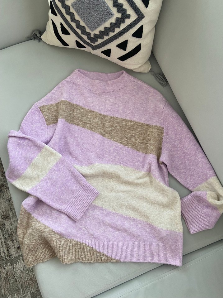 Mor, bej ve krem renkli çizgili, uzun kollu ve yuvarlak yakalı, rahat kesim kadın örgü kazak. Rahat ve gündelik tarz için uygundur.