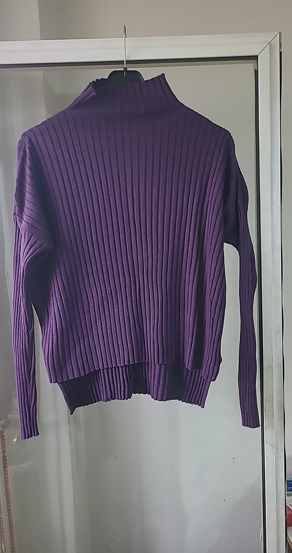 Mor renkte, balıkçı yaka ve uzun kollu, triko dokulu bu fitted kazak rahat ve sade bir stil sunar. Günlük kullanıma uygun, nervürlü dokusu normcore görünüm sağlar. ön bira kısa 53cm arkası uzun 60 cm düşük kol 50 cm omuzdan kol ölçüsü 70 en 55 cm yenidir deformasyon yok. esnek fitilli oldukça kullanışlı iade ve değişim yoktur. 44 bedene uyar. f2