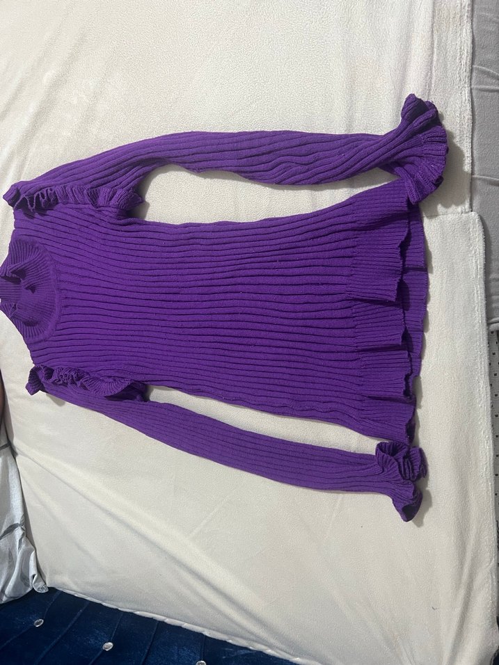 Mor, fitilli örme kumaştan yapılmış, balıkçı yaka ve uzun kollu, midi boy triko kazak. Günlük sokak stiline uygun rahat bir parça.