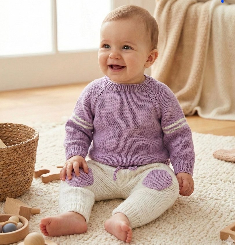 Mor triko uzun kollu, yakası yırtmaçlı üst ve beyaz üzerine mor detaylı triko pantolondan oluşan bebek takımı. Yumuşak ve konforlu kumaş kullanılmıştır.