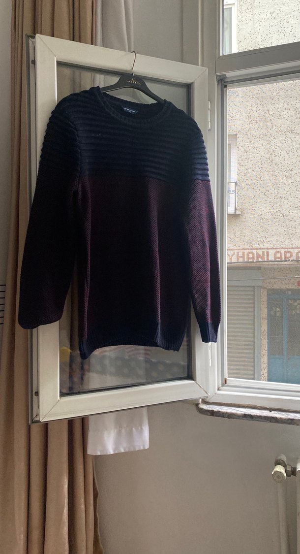 Bu örgü erkek kazak, bisiklet yaka ve uzun kolludur. Rahat kesimi ve normal boyuyla koyu mor renkte, desen içermeyen konforlu bir tasarıma sahiptir. Günlük kullanıma uygundur.