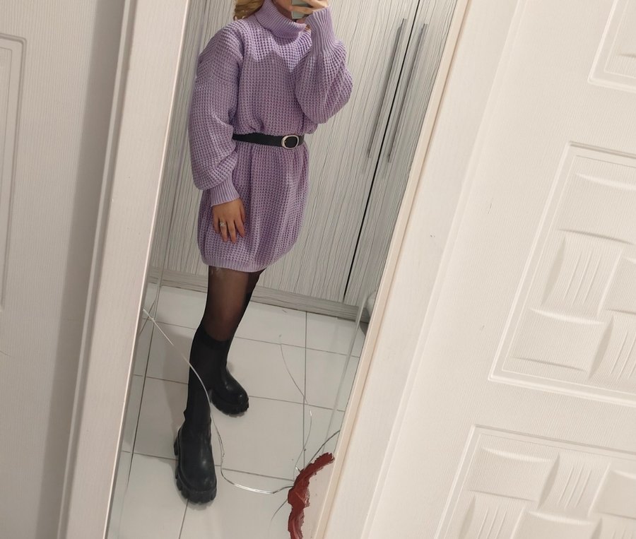 Mor renkte, boğazlı ve uzun kollu, geniş kesim triko kazak. Midi boyda, rahat günlük kullanım için uygundur.