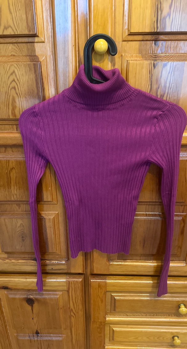 Bu mor triko boğazlı kadın kazak, fitted kesime sahip ve uzun kolludur. Yumuşak örgü kumaştan yapılmış, günlük kullanım için rahat ve şık bir sokak tarzı sunar. Desensiz ve normal midi uzunluğundadır.
