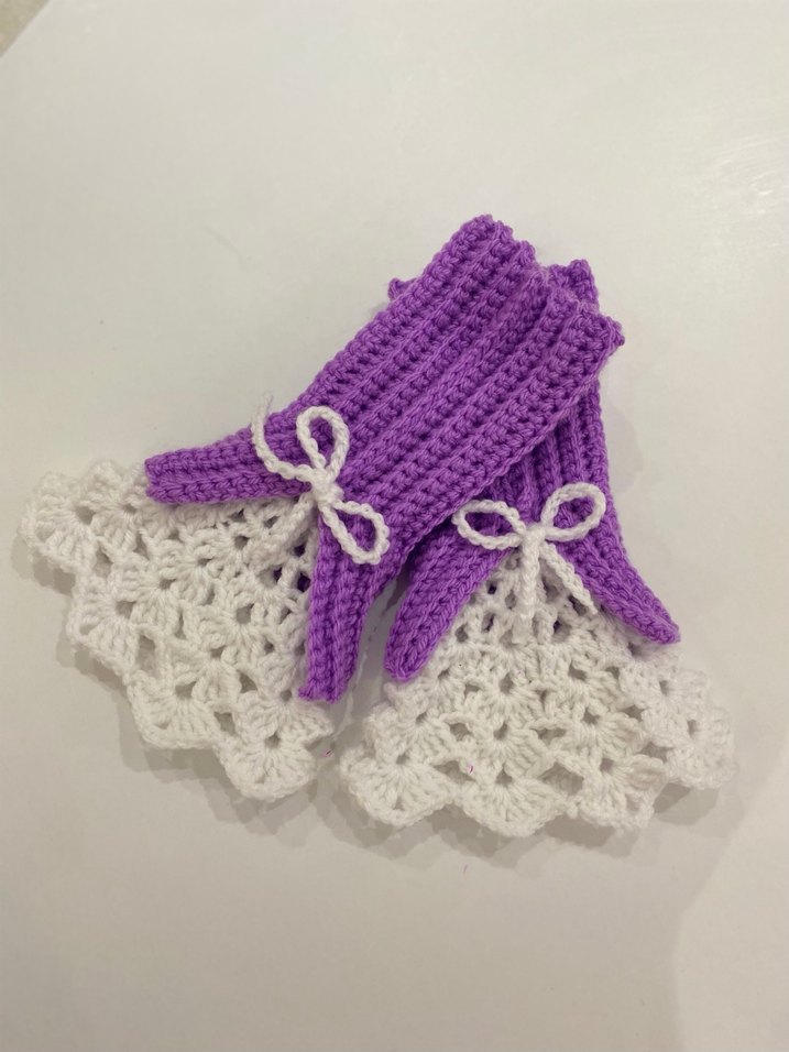 Mor triko eldivenler, beyaz dantel detayları ve küçük fiyonklarla süslenmiş, rahat ve klasik bir tarz sunar. İstenilen renk sipariş alınır ✨ Marka temsilidir