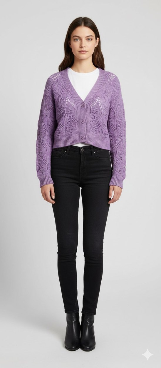 Mor renkli, düğmeli triko hırka, normal ve midi boyda, bisiklet yaka ve uzun kolludur. Gündelik kullanıma uygundur.