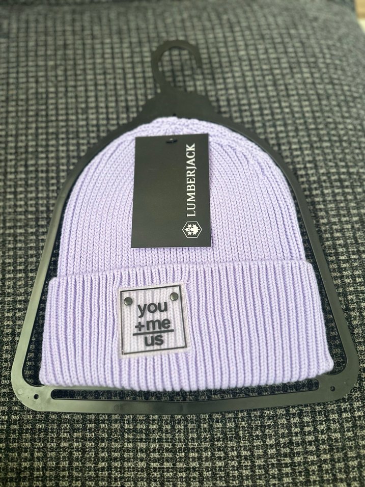 Lumberjack markalı, yumuşak triko malzemeden yapılmış mor kadın bere. Sokak stili ve rahat tasarıma sahip, 'you + me us' yazılı patch detaylı.