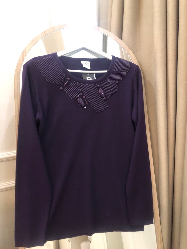 Mor renkli, bisiklet yakalı ve uzun kollu triko kadın bluz, normal midi boyda ve bol kesimdir. Desensiz ve günlük kullanıma uygun, trend normcore tarzında. 38-40 bedene tekabül ediyor.