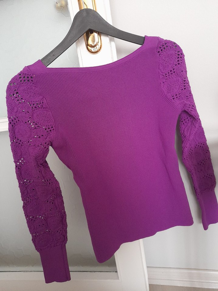 Mor renkli, triko kumaştan uzun kollu ve bisiklet yaka kadın kazak. Fitted kesim, normal boy ve rahat günlük kullanıma uygun.