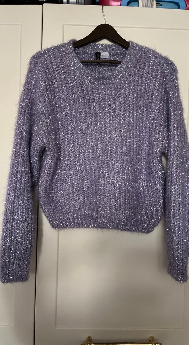 Mor renkli triko kazak, yuvarlak yaka ve uzun kolludur. Salaş kesimi ve normal boyu ile rahat bir sokak stili sunar. Günlük kullanım için uygundur.