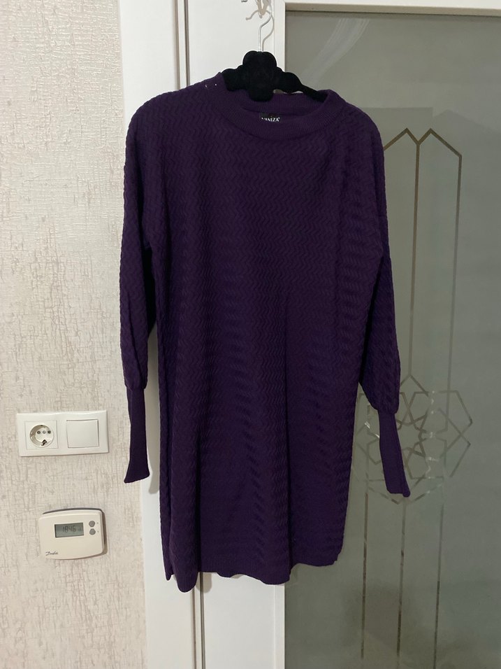 Mor renkli, uzun kollu, yuvarlak yaka, triko kumaştan yapılmış, rahat kesim midi uzunluğunda kadın kazak. Günlük kullanıma uygun, sade ve konforlu tasarım.