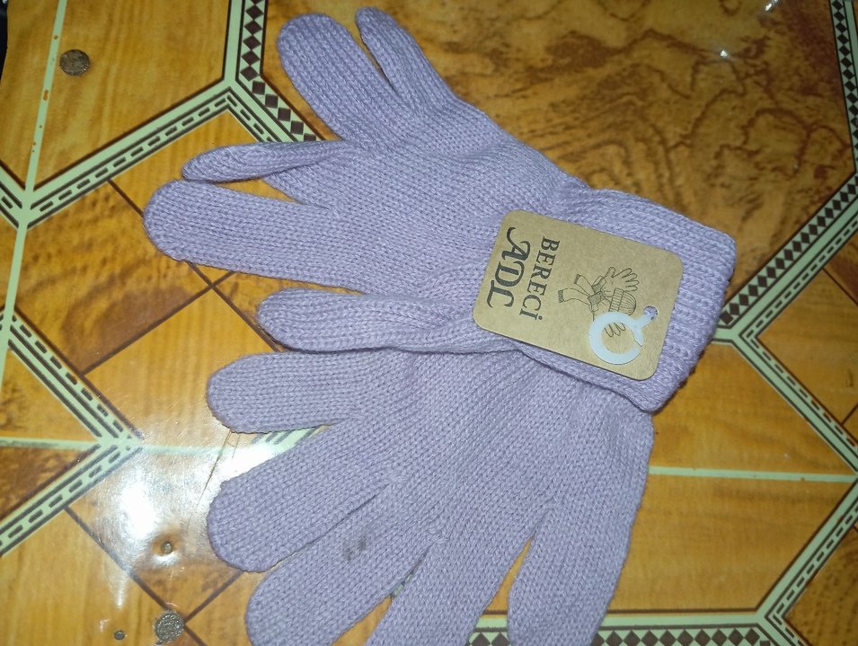 Pastel mor renkte, Bereci ADL markalı, yumuşak triko kumaştan örülmüş, rahat ve karşı kültür tarzında eldiveni.