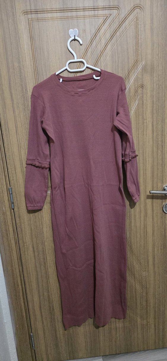 Mor renkli, rahat kesim, bisiklet yaka ve uzun kollu, hafif triko detaylı, yumuşak keten kumaştan yapılmış uzun elbisedir. Günlük kullanım için uygundur.