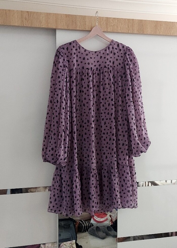 Sadece bir defa giydim. 38 beden rengi mor desenli. Astarlı