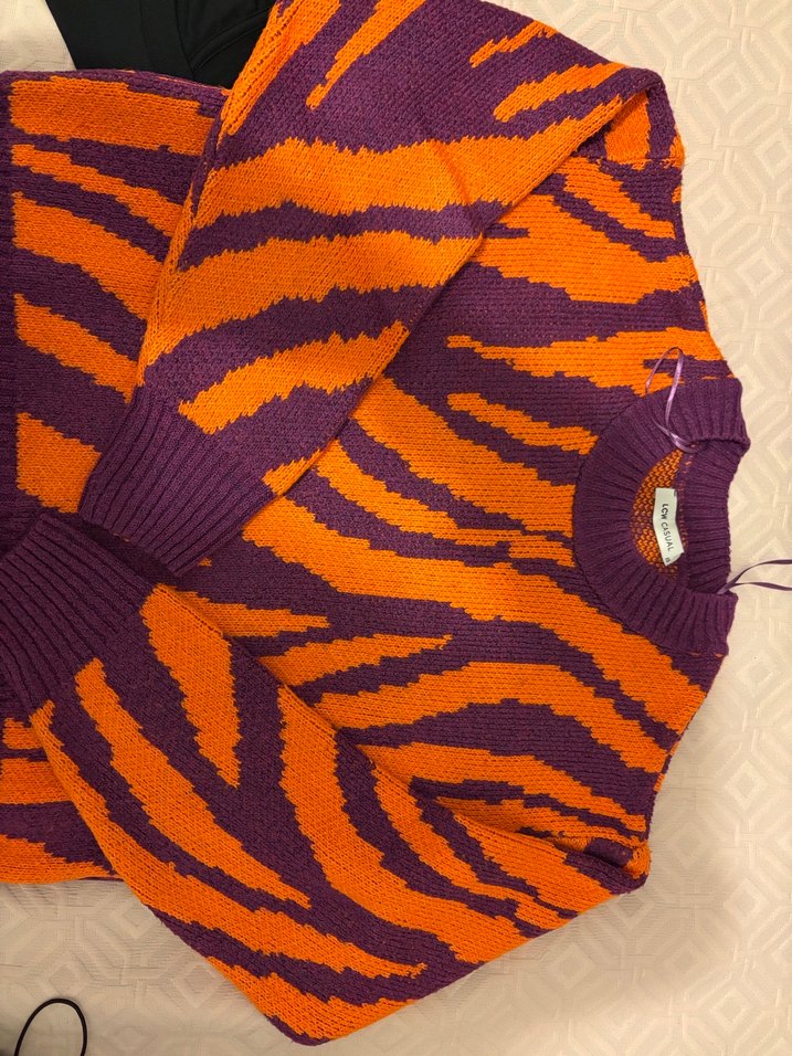 Mor ve turuncu renklerde zebra desenli, uzun kollu, boğazlı, fitted kesim kadın triko kazak. Rahat ve şık sokak stili için uygun.