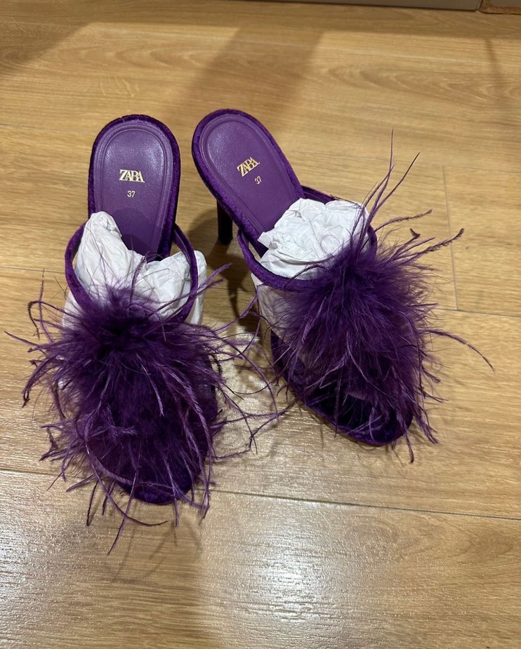 ZARA markalı, sentetik kumaştan mor, tüylü detaylı yüksek topuklu kadın terlik. Bohem tarzıyla dikkat çeker, parti için uygundur.