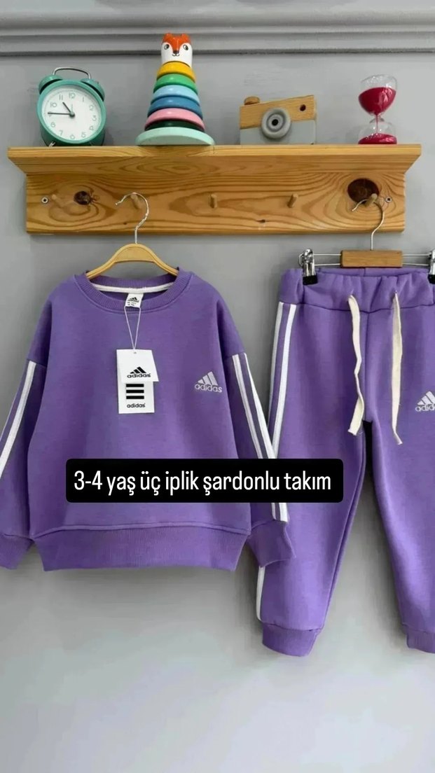 3-4 yaş için mor pastel tonlarda, yumuşak şardonlu kumaştan, bol kesim kız eşofman takımı. Bisiklet yaka sweatshirt ve baskılı, detaylı pantolon içerir.