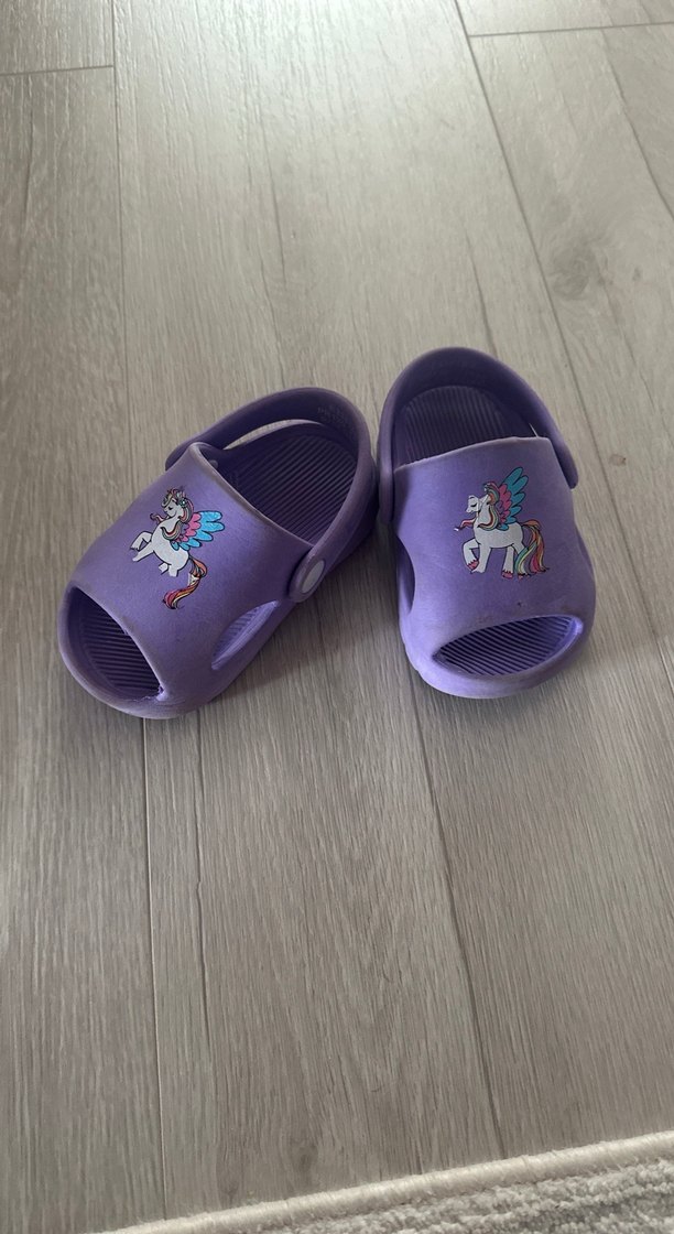 Pastel mor renkte, unicorn baskılı kız çocuk terliği, ayarlanabilir cırt cırtlı bant ile rahat kullanım sağlar. Kauçuk malzemeden üretilmiştir.