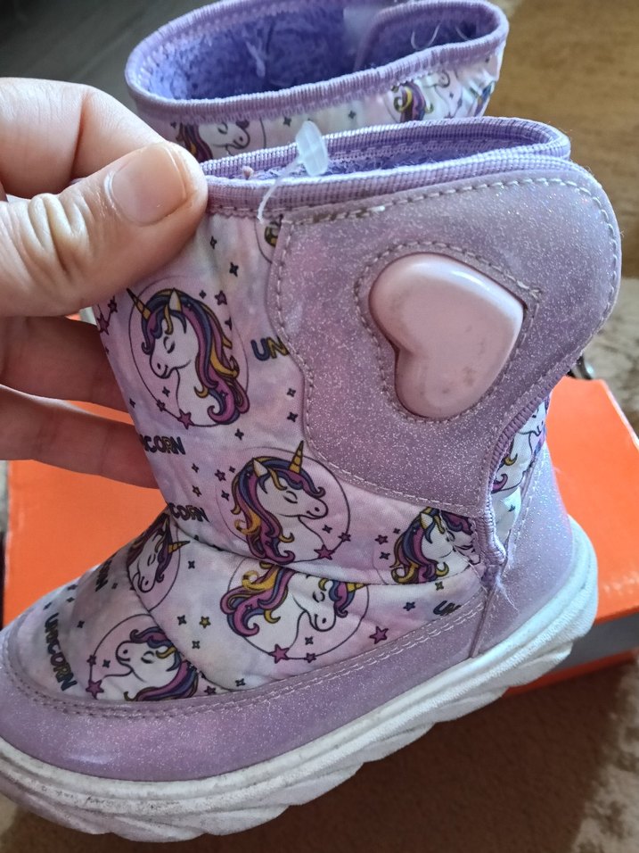 Mor renkli, pastel unicorn desenli kız çocuk botu, kalp detaylı, yumuşak kürk astarlı ve kolay kullanım için cırt cırtlıdır.