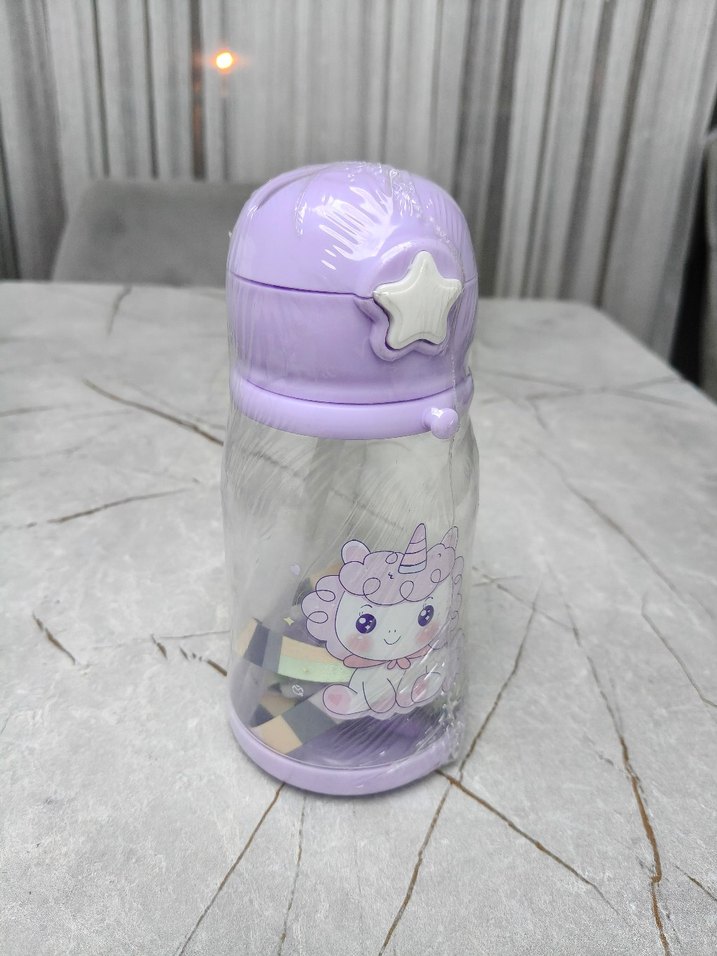 Pastel mor renkte, yıldızlı kapaklı ve sevimli unicorn desenli çocuk termos şişesi. Pipetli ve Asma ipi içindedir