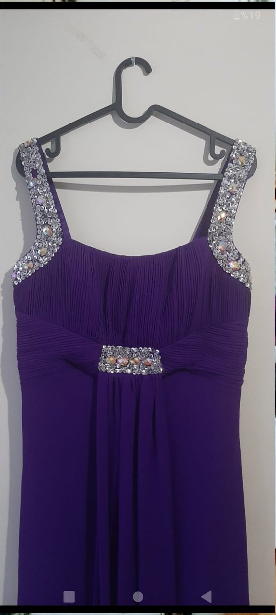 1 kere giyildi. Defosu ve lekesi yoktur. Mor uzun abiye elbise, pileli kumaş ve parlak süslemelerle. Kayık yaka ve dar kesim, düğünler içinde uygun. ✨