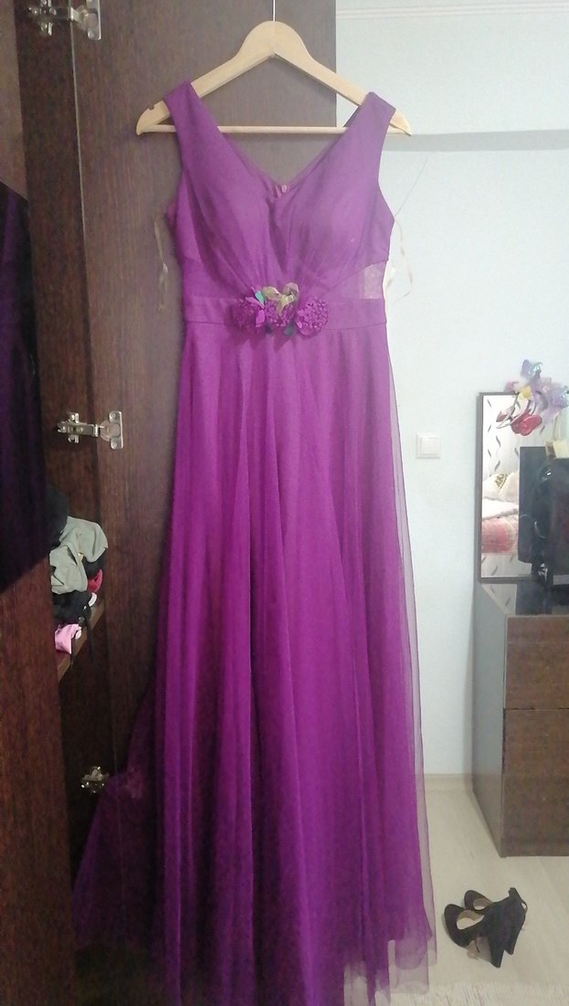Mor renkli, straplez yaka ve drapeli, vücuda oturan uzun abiye elbise. Kolsuz tasarımıyla klasik ve bohem tarzı yansıtıyor.