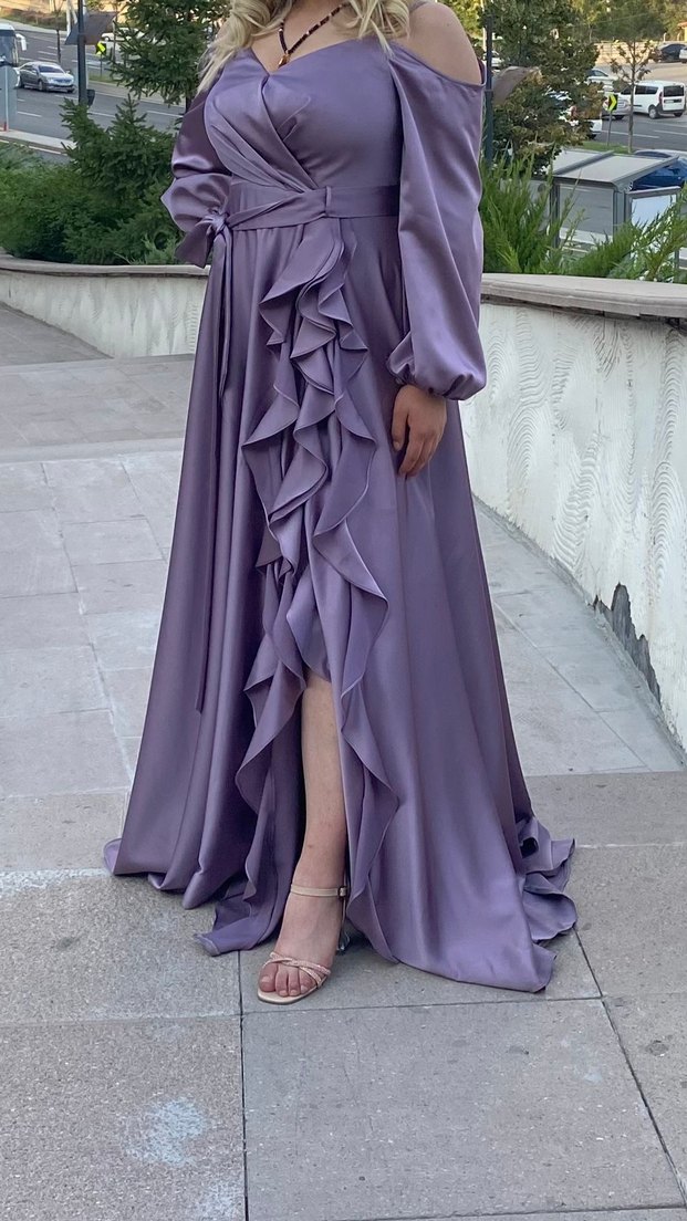 Mor renkli, uzun ve bol kesim abiye elbise, fırfır detaylı ve V yaka ile şık bir görünüm sunar. Parlak kumaşı ile göz alıcıdır. Marka öne çıkması için seçtim